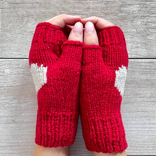 Alpaca Short Fingerless Gloves Red Cream Heart Fleece Lined