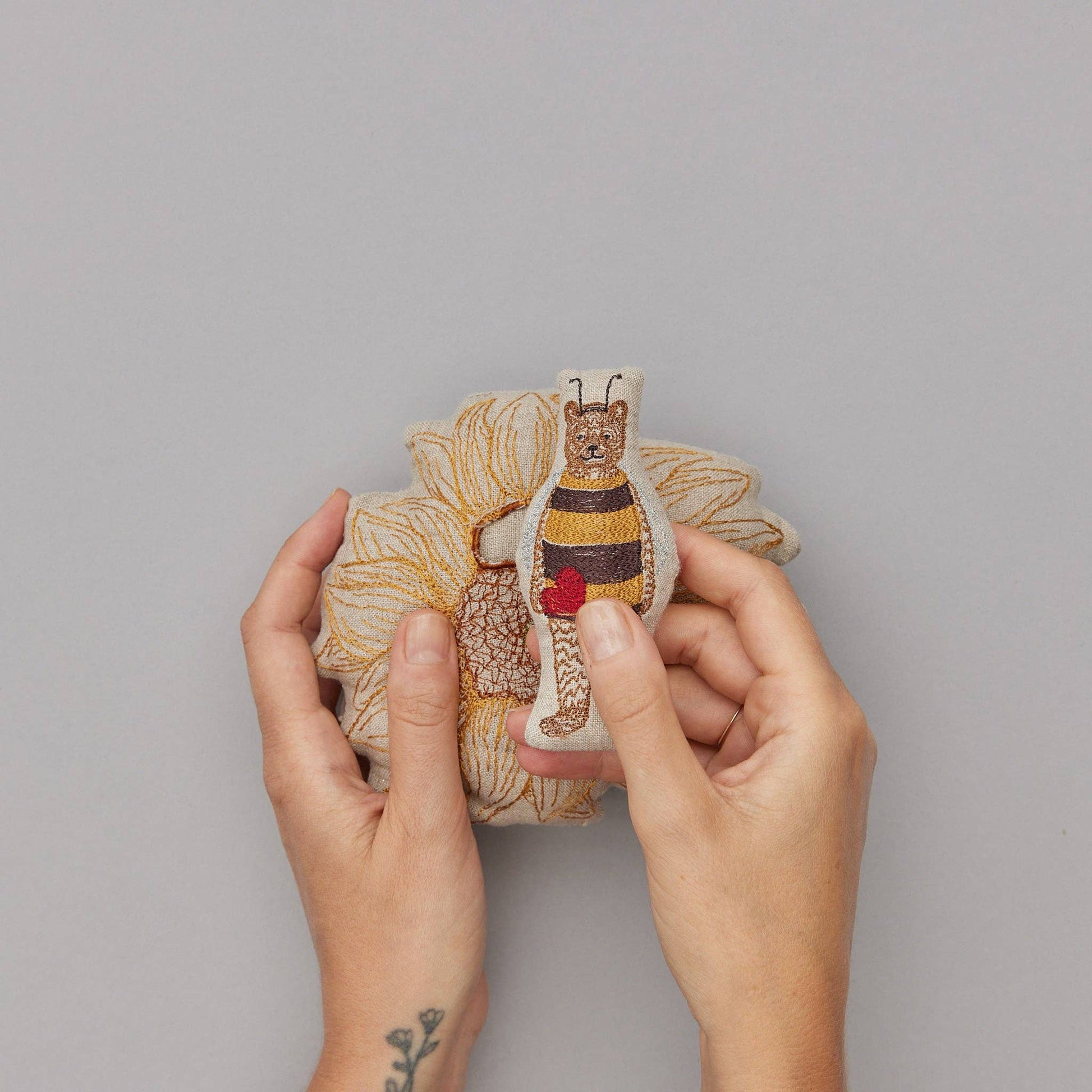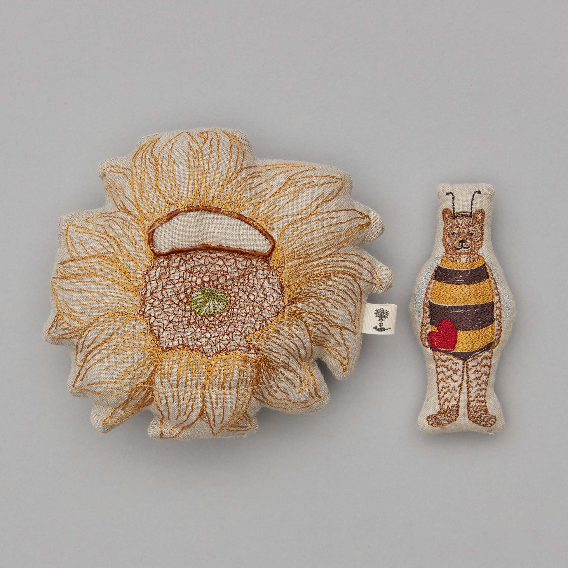 Sunflower measures 6" × 2.5" × 5.5". Bee Mine Bear pal measures 2" × 1" × 4".