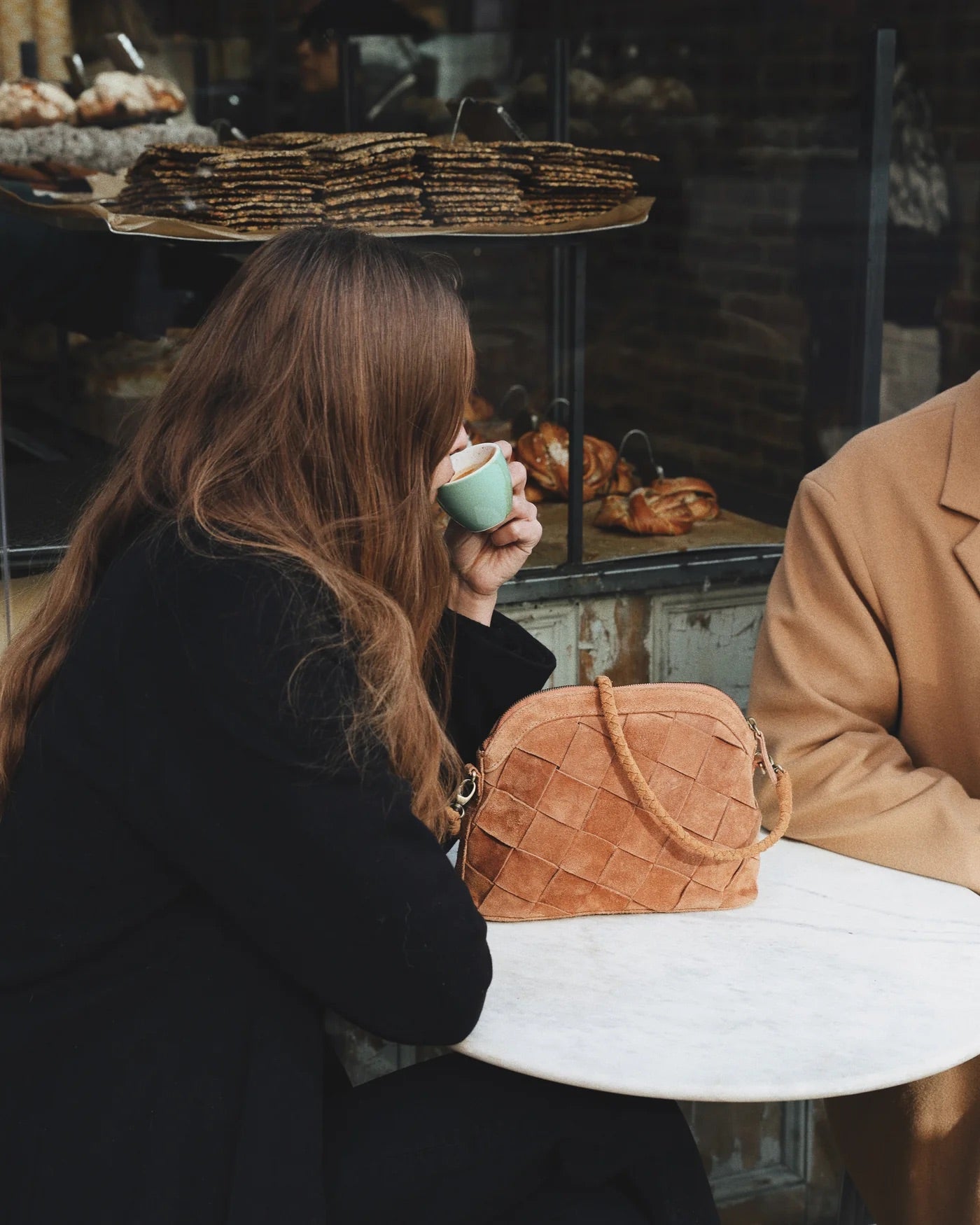 Our chic, medium-format shoulder bag is crafted from soft suede and handwoven in our signature Grande Weave, combining artisanal detail with everyday practicality. Its elegant arched shape is surprisingly roomy, easily accommodating a book, water bottle, or other daily essentials, making it both stylish and functional.