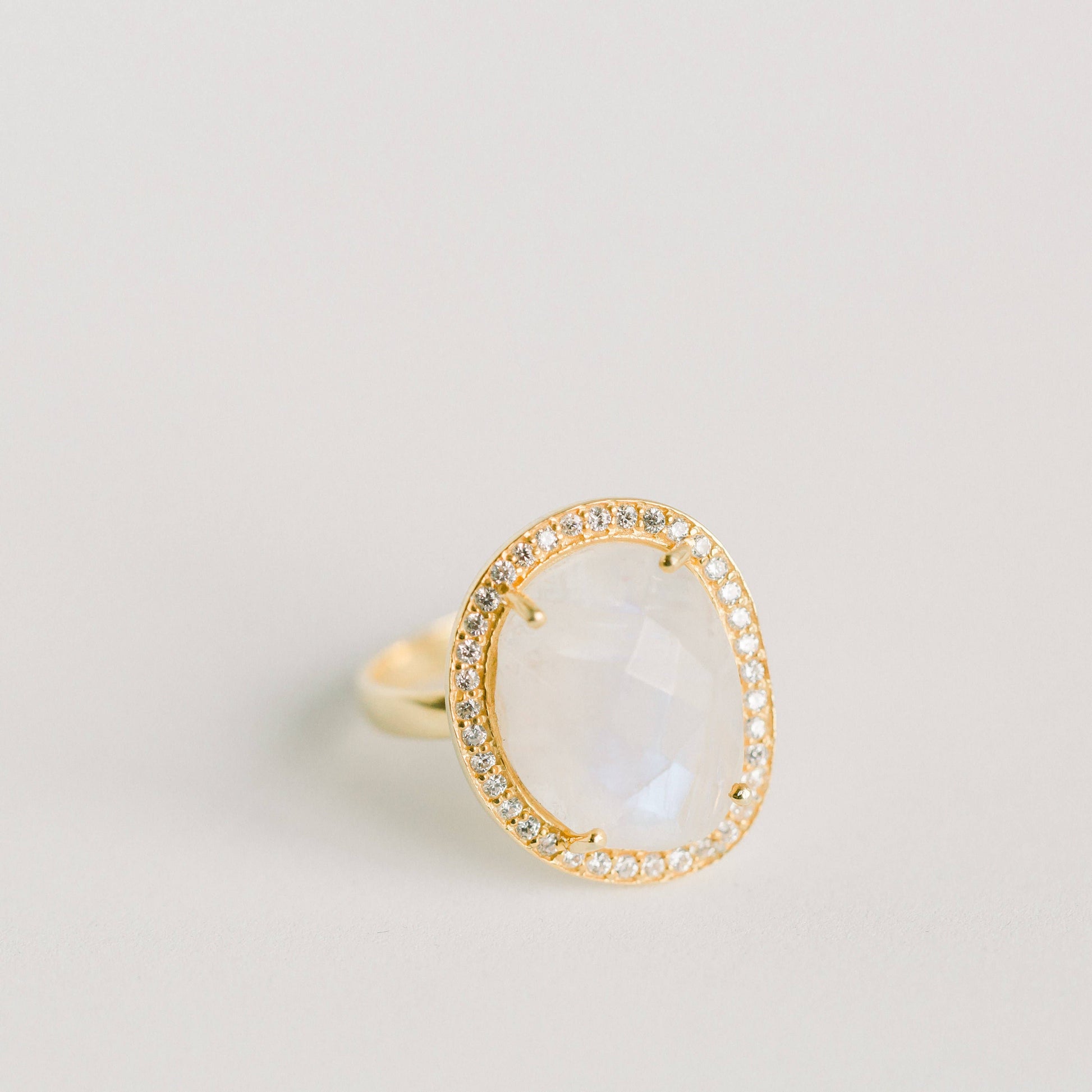 Natural Rainbow Moonstone gemstone micro pavé CZ ring set in 24K gold vermeil (925 sterling silver dipped in 24k gold). SIZE 8