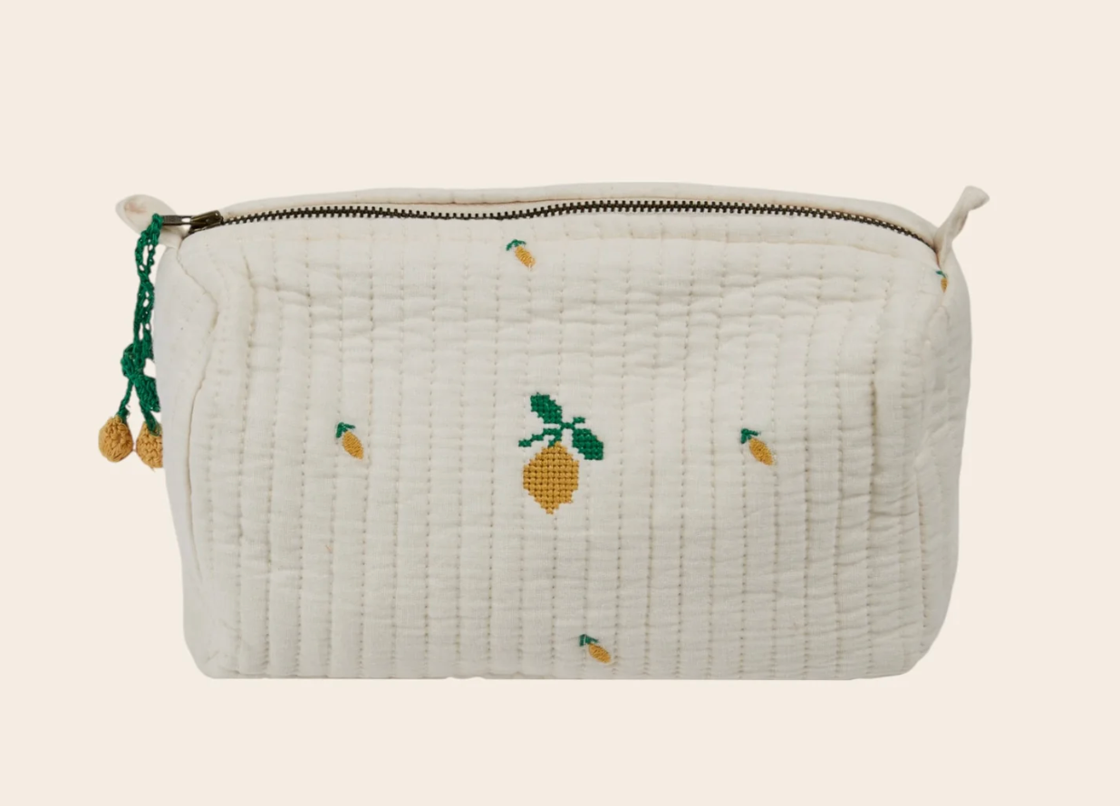 Sweet and practical, this cream-pink organic cotton toiletry bag by Emile & Ida features a floral print inspired by a vintage fabric. Compact and charming, it’s perfectly sized for everyday makeup essentials or a small first-aid kit.