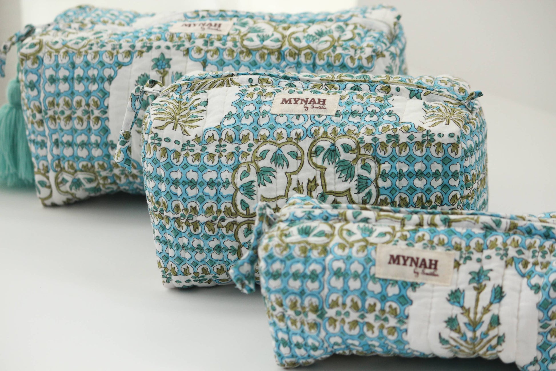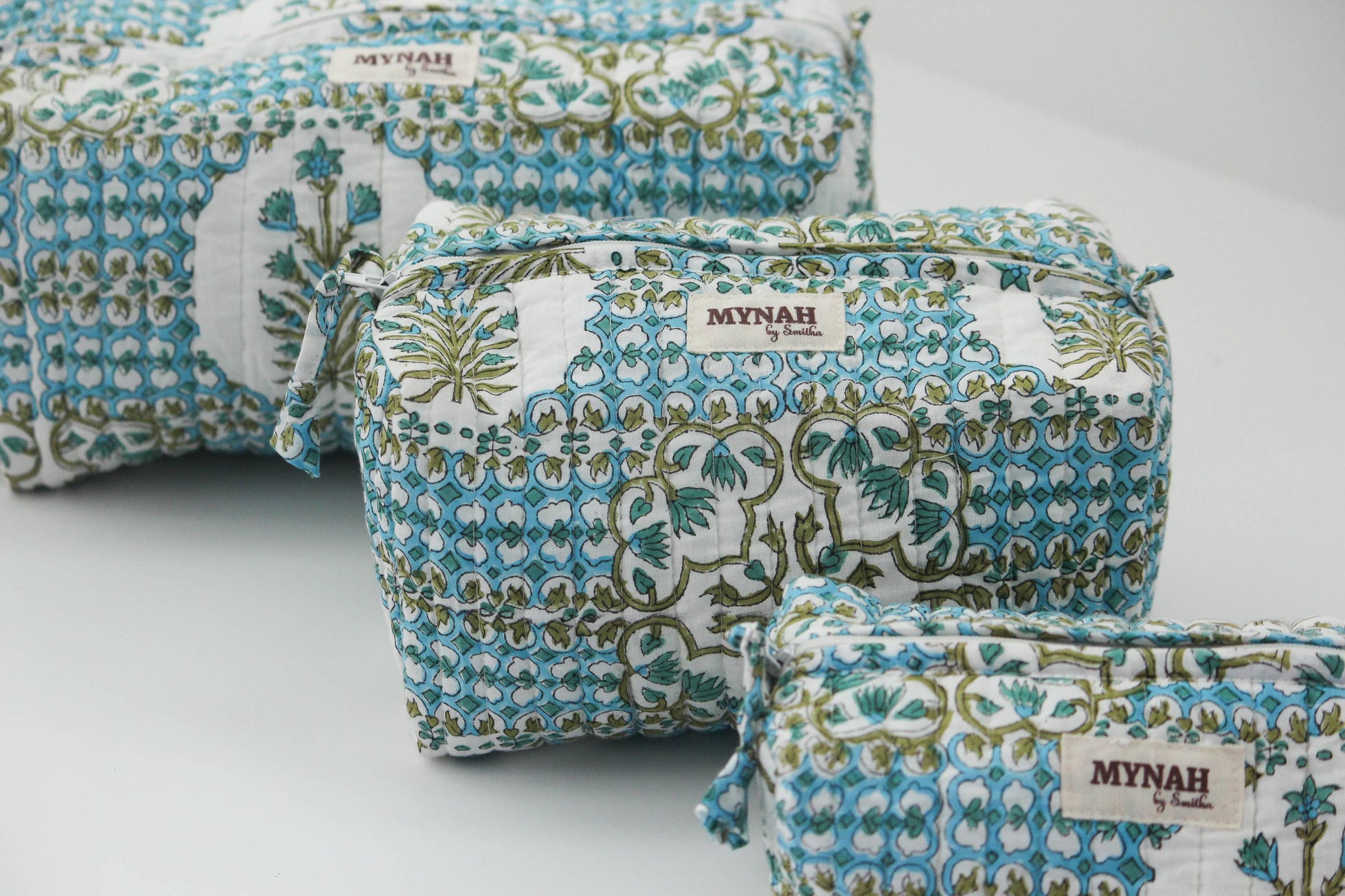 Exquisitely Crafted with Waterproof Lining and Gorgeous Hand Block-Printed Floral Cotton, quilted travel bag. The bag comes in set of 3. Has the potential to be sold individually. Each pouch in our set features a waterproof lining that guarantees the safety and dryness of your belongings. No more worrying about moisture or spills damaging your essentials. Machine washable and tumble dry. Gets softer with every wash. ✤Due to the handmade nature of the print, small beautiful irregularities are natural and adds to the organic beauty of the product✤ - Large pouch is 10”x 4.5”x 4” - Medium is 8”x 4”x4” - Small pouch is 7”x 3”x3” Our travel pouch set includes three different sizes to suit a variety of needs. You'll have a pouch for every purpose, ensuring that your essentials are neatly organized on your travels.