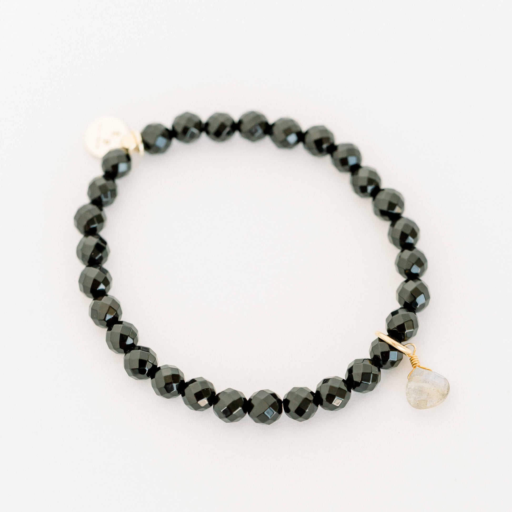 Stretch beaded bracelet made with natural Black Onyx 6mm stones and accented with a natural labradorite teardrop charm set in 14K gold vermeil.