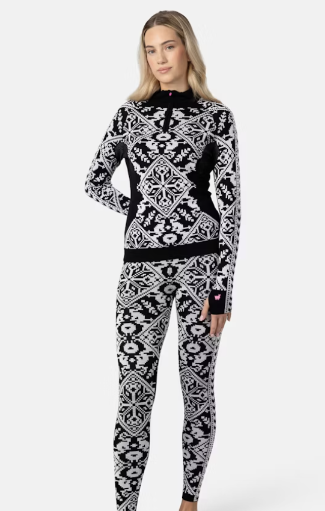 Thoughtful details like thumbholes and a snug, feminine fit make the Saga Half-Zip as practical as it is eye-catching. Layer it under your ski gear or wear it solo for a look that’s equal parts bold and functional.