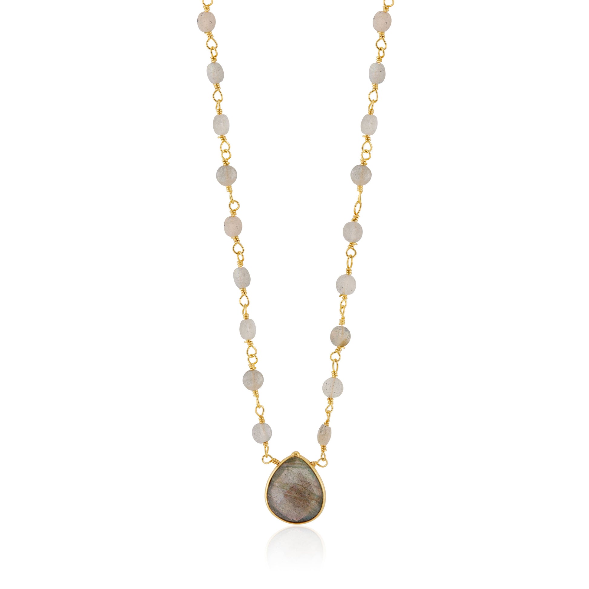The pendant hangs from a 14K gold vermeil chain, accented with labradorite beads for added depth and dimension. At 18 inches with an extended chain, it offers versatile styling options—perfect for layering with other necklaces or wearing as a standalone statement.