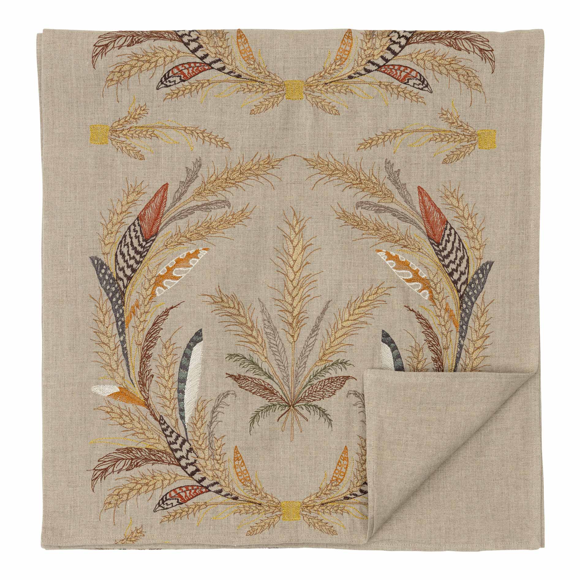 Welcome the harvest season with our Embroidered Wheat Harvest Table Runner, a timeless piece designed to bring warmth and abundance to your table. At its heart, a bouquet of golden wheat is beautifully embroidered within an autumnal wreath of feathers and wild grasses, accented with rich orange and chestnut tones. Each stitch captures the texture and beauty of the season, making it the perfect centerpiece for your fall gatherings.
